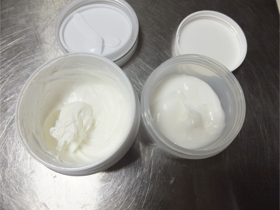 出来たクリームを二つに分けて、片方を日焼け止めクリームにします。